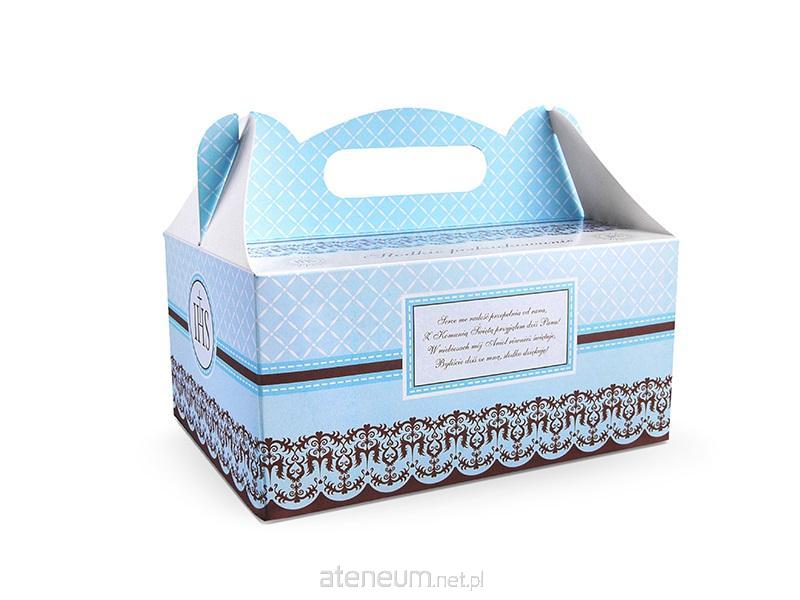 Ozdobne pudełka na ciasto komunijne z papieru z niebieskim nadrukiem i wierszykiem, wymiary pudełka po złożeniu 19x14x9 centymetrów.(1 op. / 10 szt.)
