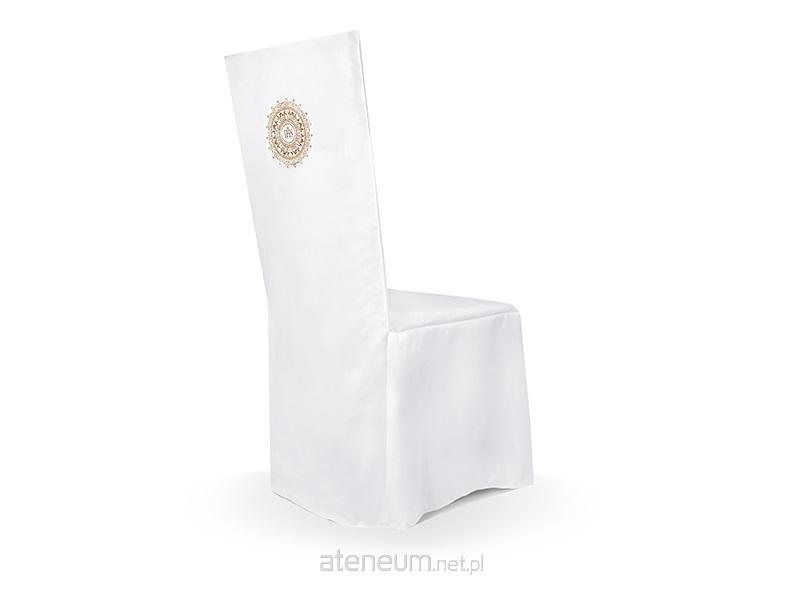 Pokrowiec komunijny na krzesło z satyny w kolorze białym, bez zakładek, z nadrukowanym emblematem IHS.