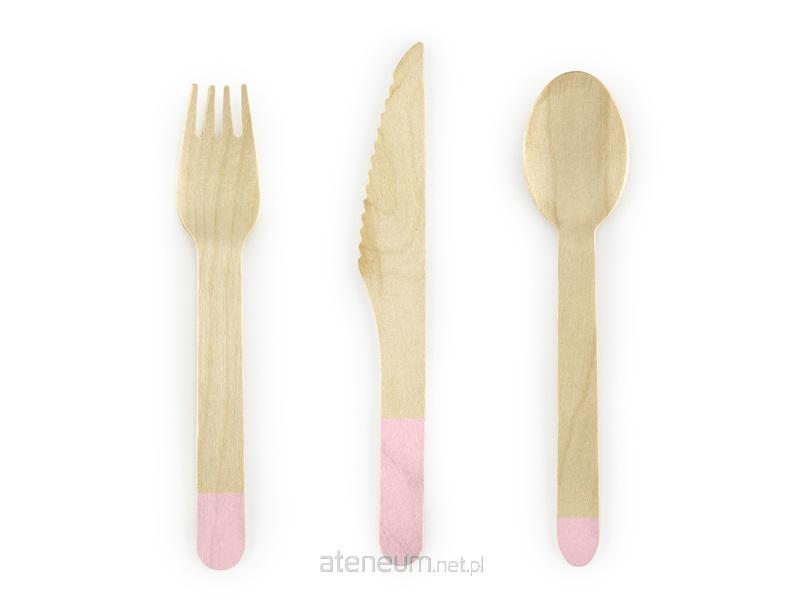 Sztućce drewniane z nadrukiem w kolorze jasnoróżowym, wysokość ok. 16 cm, zestaw zawiera 6 łyżek, 6 noży i 6 widelców.(1 op. / 18 szt.)