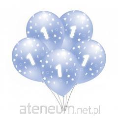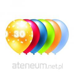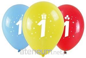 Balony kolorowe wykonane z naturalnego lateksu z obustronnym nadrukiem cyfry. Nadruk wykonany w kolorze białym, kolory balonów: czerwony, żółty i niebieski. W zależności od koloru balonu nadrukowana cyfra posiada dodatkowe atrybuty: imprezową czapeczkę, prezent lub baloniki. Balony wielkości 28 cm. W opakowaniu znajdują się 3 sztuki.