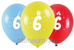 Balony kolorowe wykonane z naturalnego lateksu z obustronnym nadrukiem cyfry. Nadruk wykonany w kolorze białym, kolory balonów: czerwony, żółty i niebieski. W zależności od koloru balonu nadrukowana cyfra posiada dodatkowe atrybuty: imprezową czapeczkę, prezent lub baloniki. Balony wielkości 28 cm. W opakowaniu znajdują się 3 sztuki.