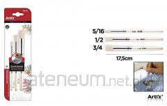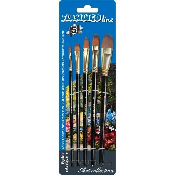 Zestaw 5 pędzli artystycznych z włosiem syntetycznym. Idealnie nadają się do bardzo precyzyjnego malowania. Gwarantują niezwykłą precyzję przydatną przy kreowaniu wszelkiego rodzaju niewielkich detali i wykończeń. Idealne do zastosowań szkolnych, domowych oraz dla artystów na każdym poziomie zaawansowania. Doskonale nadają się do farb olejnych, akrylowych, akwarelowych, gwaszy oraz farb do tkanin. Sprawdzą się również doskonale w technice decoupage podczas wykonywania drobnych detali. Wytrzymałe drewniane uchwyty z oznaczeniem grubości pędzla. Rodzaj końcówki: płaska zaokrąglona. NR: 2,6,8,10,12 . Pakowane na blistrze po 5 sztuk