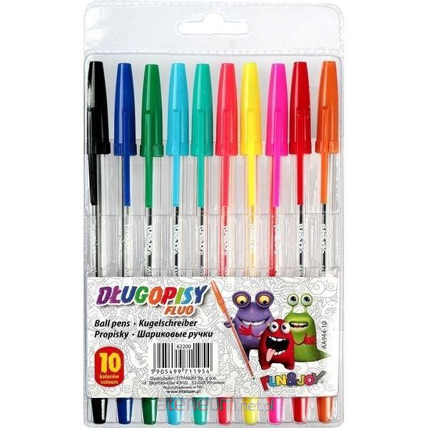 Komplet długopisów fluorescencyjnych w 10 kolorach, przezroczystej obudowie z zatyczką w kolorze wkładu. Grubość linii pisanie: 0,7 mm. Opakowanie: 10 szt.
