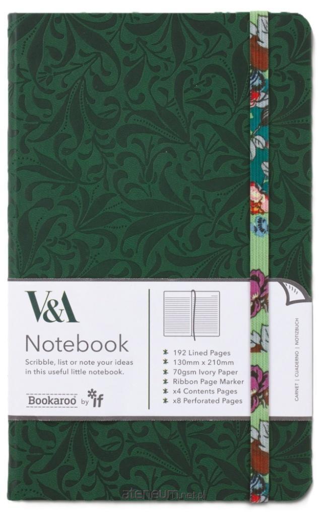 Ozdobny notatnik z wytłaczaną, twardą okładką w linie z kolekcji V&A - wzory z Muzeum Wiktorii i Alberta. W środku znajdują się 192 strony, z czego 8 jest perforowanych, aby można je wyrwać. Dobrej jakości papier, który jest w kolorze kości słoniowej. Notatnik posiada wstążkę-zakładkę oraz gumkę do zamykania.