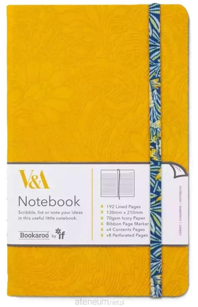 Ozdobny notatnik z wytłaczaną, twardą okładką w linie z kolekcji V&A - wzory z Muzeum Wiktorii i Alberta. W środku znajdują się 192 strony, z czego 8 jest perforowanych, aby można je wyrwać. Dobrej jakości papier, który jest w kolorze kości słoniowej. Notatnik posiada wstążkę-zakładkę oraz gumkę do zamykania.