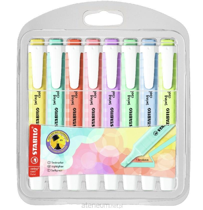 STABILO swing cool Pastel - zakreślacz dla dzieci, młodzieży i osób które podróżują w modnych, pastelowych tonacjach. Kieszonkowy format zakreślacza z praktycznym klipsem do zaczepiania sprawia, że nie zajmuje dużo miejsca więc można go zawsze mieć przy sobie (w torbie, piórniku, kieszeni). Technologia Anti-Dry-Out sprawia, że pozostawiony bez skuwki nawet prze 4 godziny nie zasycha. Grubość linii 1-4 mm. Dostępny w 14 pastelowych kolorach. Plastikowe etui zawierające 8 szt. w kolorach: żółty, turkusowy, różowy, fioletowy, zielony, limonkowy, niebieski, czerwony.