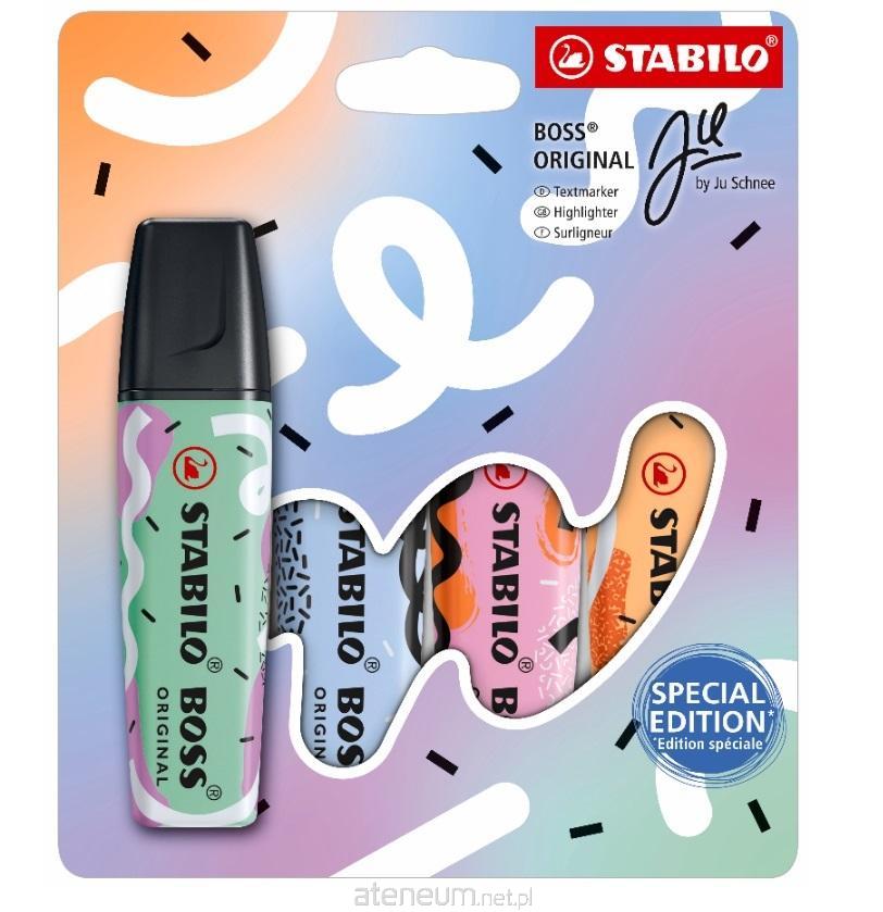STABILO BOSS ORIGINAL Ju Schnee to pierwsza, limitowana edycja klasycznego zakreślacza. Ozdobne motywy nadrukowane na całej obudowie, zostały zaprojektowane przez młodą artystkę - Ju Schnee. Te wyjątkowe zakreślacze dostępne są w 4 pastelowych kolorach oraz _x000B_w efektownych opakowaniach, które zachęcają do zakupu i wypróbowania ich w akcji. Dzięki nim rysowanie, szkicowanie czy ozdobne pisanie staje się zabawą! Kartonowe etui zawierające 4 szt. zakreślaczy w kolorach pastelowych: zielonym, niebieskim, pomarańczowym, chłodna fuksja.