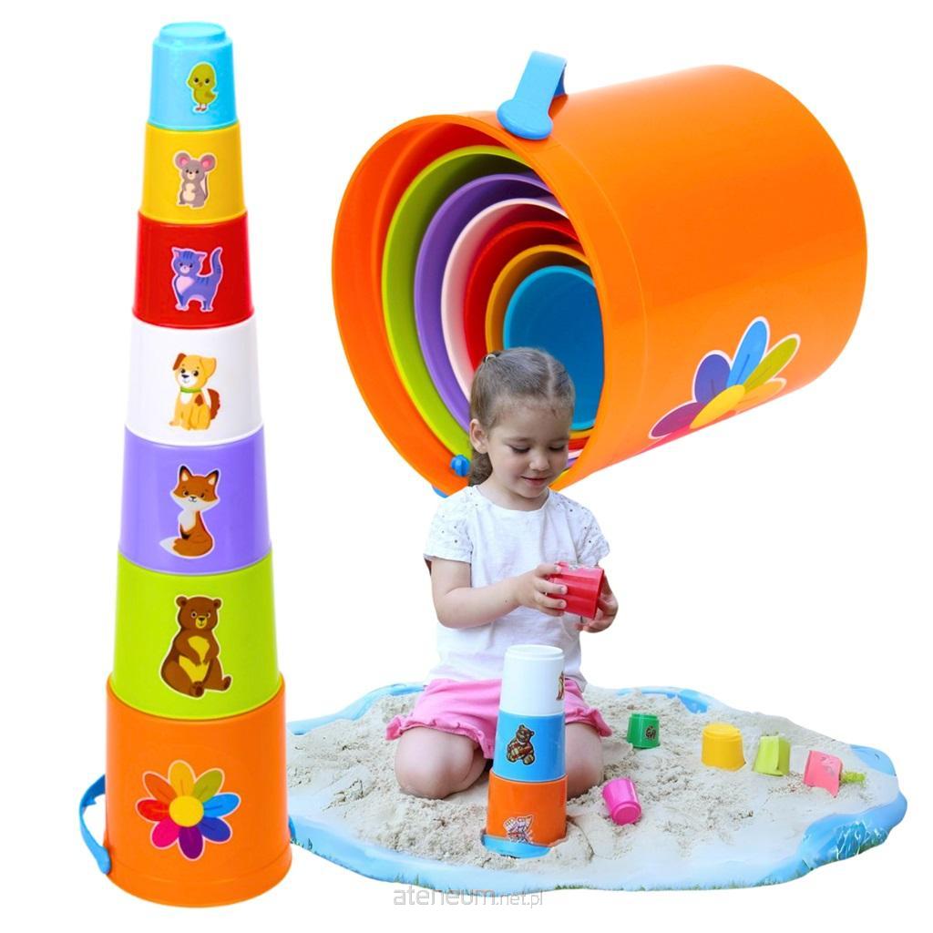 Piramida składa się z 7 kolorowych wiaderek z naklejkami, największe wiaderko posiada uchwyt. Dziecko może stworzyć wysoką piramidę lub wykorzystać wiaderka do piaskownicy.