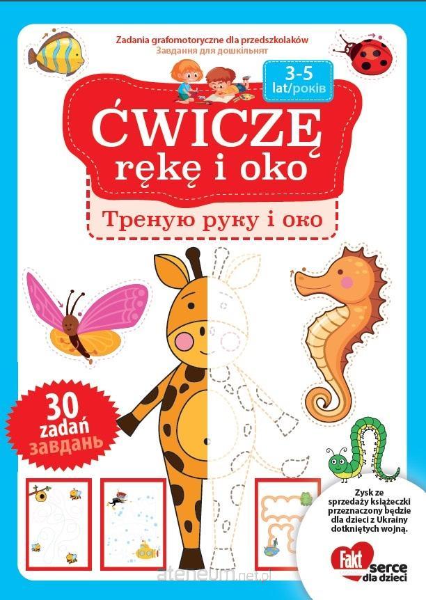 Ćwiczę rękę i oko" - to zbiór 30 zadań dla dzieci w wieku przedszkolnym, które w zachęcający sposób przygotowują do nauki pisania. Wesołe zwierzątka i przerywane kolorowe linie łączą naukę z zabawą. Każde z rozwiązanych zadań można pomalować farbami, kredkami, flamastrami lub wykleić bibułą lub kolorowym papierem. "Ćwiczę rękę i oko" to kreatywne narzędzie pomocne w rozwijaniu motoryki małej. Książeczka dla dzieci w wersji dwujęzycznej: polsko-ukraińskiej wydana we współpracy z Fundacją Faktu.