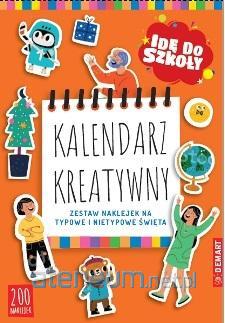 Kalendarz kreatywny to zestaw 32 kart z mnóstwem naklejek do wykorzystania z okazji typowych i nietypowych świąt w ciągu całego roku szkolnego: rozpoczęcia roku szkolnego, Międzynarodowego Dnia Kropki, pierwszego dnia astronomicznej jesieni, zimy, wiosny i lata, Dnia Chłopaka, Światowego Dnia Drzewa, Dnia Edukacji Narodowej, Święta Dyni i Halloween, Dnia Wszystkich Świętych, Narodowego Święta Niepodległości, Światowego Dnia Pluszowego Misia, mikołajek, Bożego Narodzenia, Nowego Roku, Dnia Wiedzy o Pingwinach, Dnia Babci i Dnia Dziadka, Międzynarodowego Dnia Pizzy, tłustego czwartku, walentynek, Światowego Dnia Kota, Dinozaura, Dnia Piegów, Międzynarodowego Dnia Kobiet, Światowego Dnia Zespołu Downa, Międzynarodowego Dnia Teatru, Wielkanocy, Światowego Dnia Świadomości Autyzmu, Światowego Dnia Czekolady, Dnia Ziemi, Dnia Flagi Rzeczpospolitej Polskiej i Narodowego Święta Konstytucji 3 Maja, Międzynarodowego Dnia Strażaka, Światowego Dnia Kosmosu, Dnia Matki i Dnia Ojca, Dnia Dziecka, Dnia Przyjaciela i wakacji.