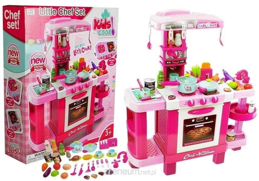 Duża Kuchnia dla dzieci Toster Ekspres Różowa Czy Twoje dziecko uwielbia bawić się w kucharza i kręci się w kuchni kiedy gotujesz? A może próbujesz rozbudzić w nim pasję gotowania i tworzenia wystrzałowych dań? W każdym z tych przypadków, nasza kuchnia dla małego kucharza to idealny pomysł na prezent! Ten dużych rozmiarów zestaw kuchenny to prawdziwy rarytas dla każdej młodocianej pani domu. Utrzymane w różowych kolorach mebelki i sprzęt AGD jasno daje do zrozumienia, kto rządzi w kuchni! Gotowanie, pieczenie, smażenie, krojenie, mieszanie... Cała paleta możliwości! Jednak czym jest kuchnia bez produktów żywnościowych? Ich również można znaleźć w zestawie całą masę - warzywa, owoce a nawet żywność puszkowana będą świetnymi akcesoriami urozmaicającymi zabawę. Kuchnia posiada wiele ciekawych elementów: - palnik gazowy i płytę indukcyjną, które po uruchomieniu podświetlają się oraz wydają odgłos gotowania, - duży, pojemny piekarnik, z odgłosami pracy i alarmem, - toster, z którego po naciągnięciu guziczka wyskakują tosty - ekspres do kawy na kapsułki, - blat roboczy, - wygodne półeczki i haki na przybory kuchenne. W skład zestawu wchodzi: - rondelek, - patelnia z dwoma uchwytami, - 2 pokrywki, - 4 talerze, - 2 filiżanki, - przybory kuchenne: bezpieczny nóż, chochelka, łyżka do makaronu, łopatka, - sztućce: nóż, widelec, łyżka, - solniczka, - butelki z mlekiem, napojem i ketchupem, - kapsułki z nazwami różnych kaw: latte, black coffee, milk coffee, - artykuły spożywcze: pomarańcza, jabłko, kapusta, marchewka, bakłażan, jajko, nóżka kurczaka, tost, 2 konserwy Wymiary kuchni: wysokość - 87 cm szerokość - 78 cm głębokość - 29 cm Wymiary opakowania: 66 cm x 53 cm x 15.5 cm Do uruchomienia wszystkich funkcji kuchni potrzeba trzech baterii "AA" 1.5 V.