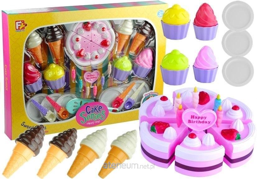 Wieloelementowy zestaw do zabawy w przyjęcie urodzinowe Serwis deserowy składa się z dużej liczby elementów - w zestawie znajduje się ich aż 32. Umożliwia on rewelacyjną zabawę w organizację przyjęcia urodzinowego, na którym mogą gościć zarówno misie i lalki, jak i domownicy bądź koleżanki. W komplecie znajduje się wszystko to, co uwielbiają małe dzieciaki - przesłodki tort, lody i muffinki, oblane apetyczną, kolorową polewą. Serwis nie byłby kompletny, gdyby nie znalazła się w nim zastawa - do zabawki dołączono urocze łyżeczki w kształcie lodów, a także klasyczne, białe talerzyki. Jeśli Twoja pociecha uwielbia bawić się w wyprawianie przyjęć czy dom, ten zestaw z pewnością spełni jej marzenia. Duża liczba elementów wchodzących w skład zestawu rewelacyjnie sprawdzi się w duecie z innymi zabawkami, czyniąc przyjęcie bardzo wystawnym. Serwis urodzinowy posiada przyjemne, pastelowe kolory, co z pewnością przyciągnie wzrok dziecka i zachęci do zabawy. Udawane przyjęcia rozwiną kreatywność i wyobraźnię dziecka, a także rozwiną koordynację i zdolności manualne malucha. Przeróżne kształty, faktury i kolory rozwiną zmysł wzroku i dotyku u maluchów, co jest bardzo istotne w pierwszych miesiącach i latach życia. Uważamy, że jest to zabawka, która powinna znaleźć się w pokoju każdej dziewczynki. W zestawie znajdują się: - 6-kawałkowy tort, - 4 lody w wafelkach, - 4 muffinki w polewie, - 6 talerzyków, - 4 łyżeczki, - szpatułka do nakładania tortu, - 6 świeczek, - serduszko z napisem " Happy Birthday". Zabawka posiada certyfikat CE, gwarantujący bezpieczeństwo płynące z użytkowania elementów. Wszelkie słodkości wykonane są z atestowanego, solidnego materiału, jakim jest plastik. Wielkość elementów dostosowana jest do rączek dzieci powyżej 3. roku życia. Ich konstrukcja jest lekka, pozbawiona ostrych zakończeń. Kolorowy zestaw zapakowany jest w duże pudełko z przeźroczystą witrynką, dzięki czemu zabawka spodoba się każdemu dziecku już od pierwszego wejrzenia. Wymiary wybranych elementów zabawki: - tort: 15 cm x 15 cm, - lód w rożku: 13 cm x 5 cm, - muffinka mała: 6,5 cm x 7,5 cm, - muffinka duża: 6,5 cm x 9 cm, - talerzyk: 8 cm x 8 cm, - łyżeczka: 10 cm, - świeczka: 4,5 cm. Wymiary opakowania: - 50 cm x 35 cm x 6 cm.