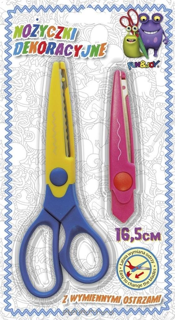 Nożyczki dekoracyjne do wycinania fantazyjnych wzorów. Ostrza wykonane ze stali nierdzewnej a uchwyt nożyczek z mocnego, trwałego plastiku. Długość nożyczek: 16,5 cm. W komplecie nożyczki i 1 wymienne ostrze z innym wzorem cięcia.