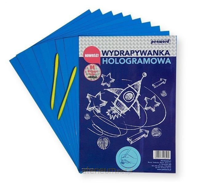 W zestawie 10 arkuszy pokrytych czarną farbą oraz dodatkowo 2 rysiki z dwoma różnymi końcówkami, służące do wydrapywania obrazków.