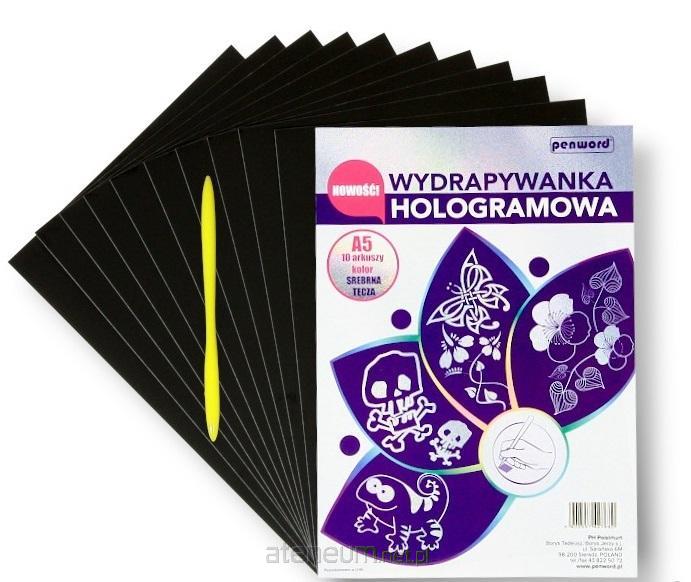 W zestawie 10 arkuszy pokrytych czarną farbą oraz dodatkowo rysik, służący do wydrapywania obrazków.