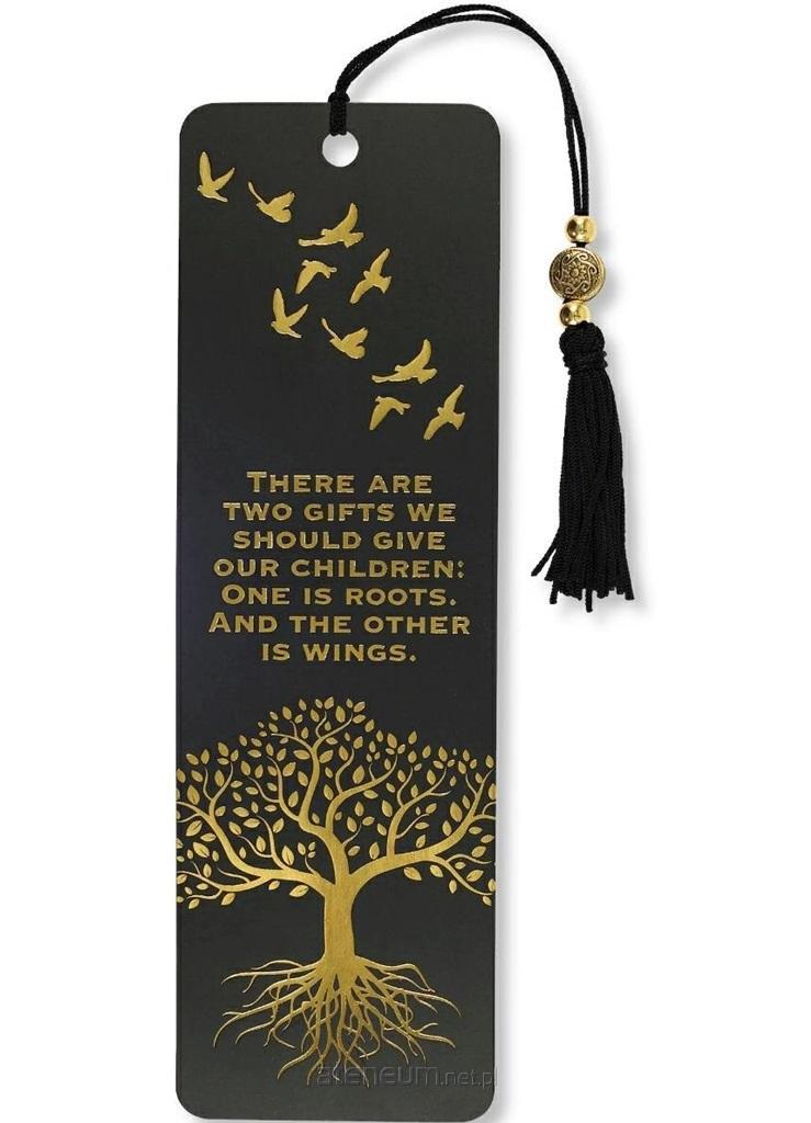 Zakładka do książki firmy Peter Pauper Press - Korzenie i skrzydła (Roots and Wings). "Są dwa prezenty, które powinniśmy dać naszym dzieciom: jeden to korzenie, a drugi to skrzydła". Zakładka ma dopasowaną kolorystycznie wstążkę z frędzlem oraz koralik. Barwne, trwałe, zabawne lub motywujące nadruki sprawią, że czytanie będzie jeszcze ciekawsze. Każda zakładka jest drukowana na trwałym, powlekanym kartonie i pakowana w przezroczystą osłonkę. Uniwersalny wymiar 6,4 x 18,1 cm.