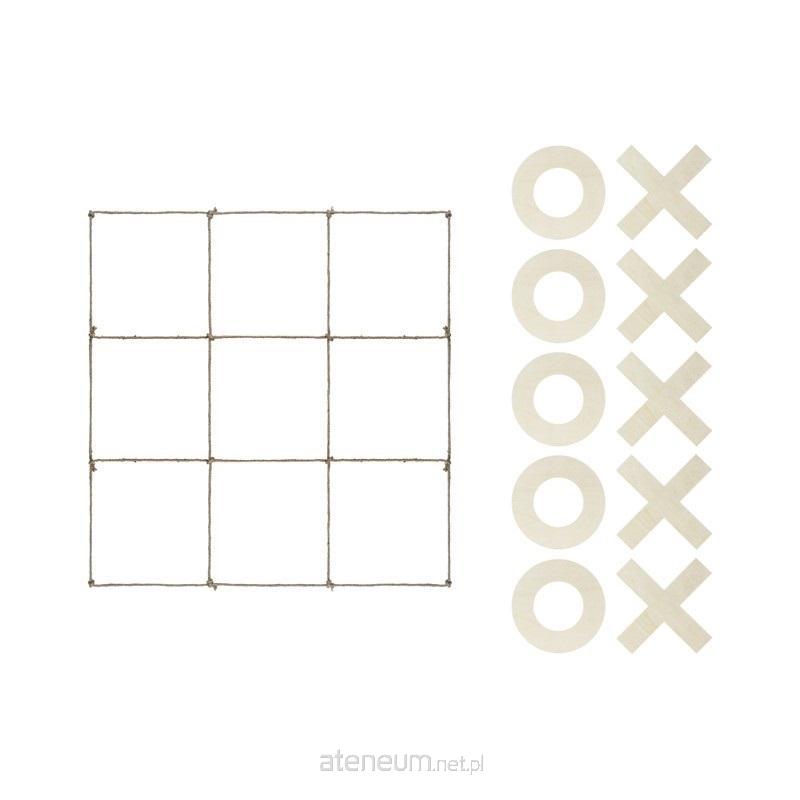 Gra Kółko i Krzyżyk, zawiera: 5 drewnianych kółek, 5 drewnianych krzyżyków i planszę z jutowego sznurka, wymiary elementów: plansza ok. 120 x 112 cm, kółko ok. 23 x 23 cm, krzyżyk ok. 27.5 x 27.5 cm.