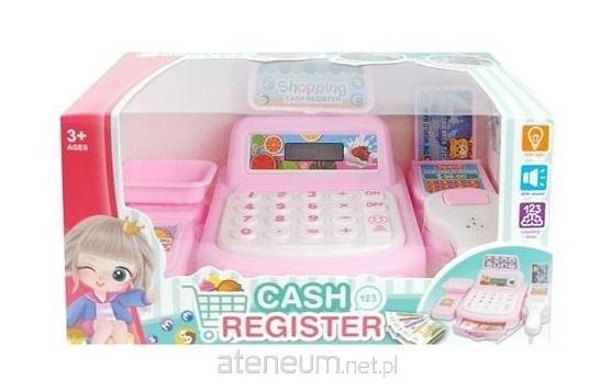 Różowa kasa sklepowa z czytnikiem, wagą i pieniążkami. Kasa na baterie