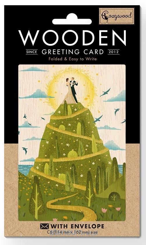 Drewniany karnet w formacie C6 z kopertą. W środku nie zawiera tekstu. Ten karnet jest w 100% biodegradowalny, wykonany przy użyciu minimalnego nakładu energii, gazu i wody. Jego wytworzenie zużywa 5 razy mniej drewna niż wykonanie karnetu papierowego. Wyprodukowany na Litwie.