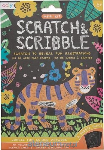 Wesoła dżungla czeka na odkrycie! Użyj dołączonego drewnianego rysika, zdrap czarną warstwę i odsłoń kolorowy obrazek pełen egzotycznych, kolorowych zwierząt.
