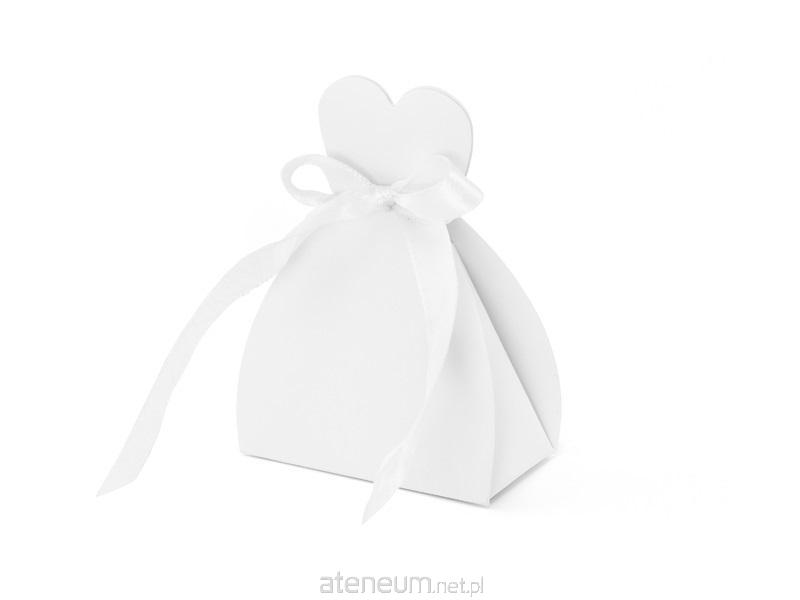 Pudełeczka Panna Młoda wykonane z papieru w kolorze białym, z satynową tasiemką, idealne na prezenciki dla gości, wymiary po złożeniu 6,5x3x5 centymetrów (z serduszkiem 9 cm.).(1 op. / 10 szt.)