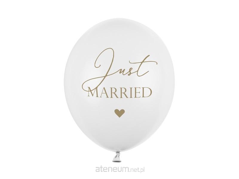Balony Strong, Pastel Pure White ze złotym dwustronnym nadrukiem Just Married, średnica 30 cm(1 op. / 50 szt.)