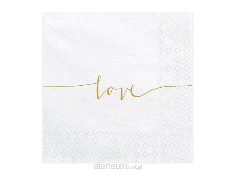 Serwetki trójwarstwowe w kolorze białym ze złotym napisem Love, wymiary po rozłożeniu ok. 33 x 33 cm, wymiary po złożeniu ok. 16,5 x 16,5 cm.(1 op. / 20 szt.)