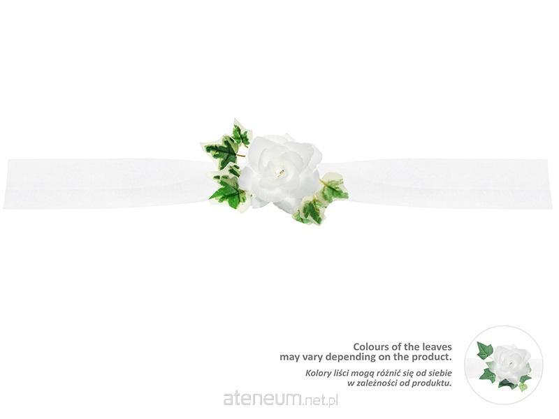Girlanda z tiulu w kolorze białym, z białymi różyczkami i zielonymi listkami, długość 1,70 metra.