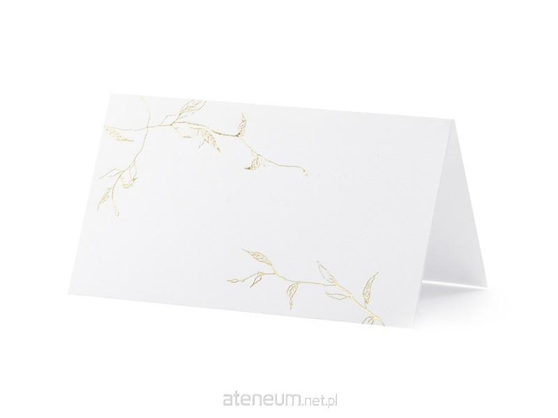 Wizytówki na stół wykonane z papieru w kolorze białym, ze złotym metalizowanym wzorem gałązek, wymiary po złożeniu ok. 9,5 x 5,5 cm.(1 op. / 10 szt.)