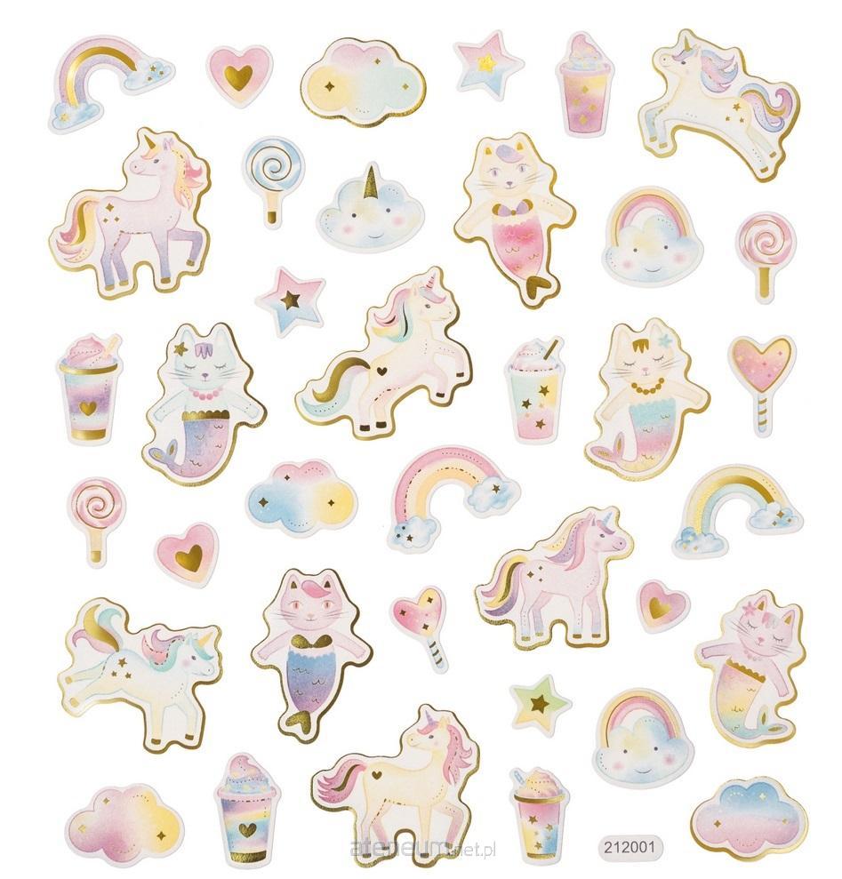aklejki z jednorożcami, tęczami i kotkami-syrenkami. Uroku i blasku dodają im pastelowa kolorystyka, perłowy papier i złocenia.