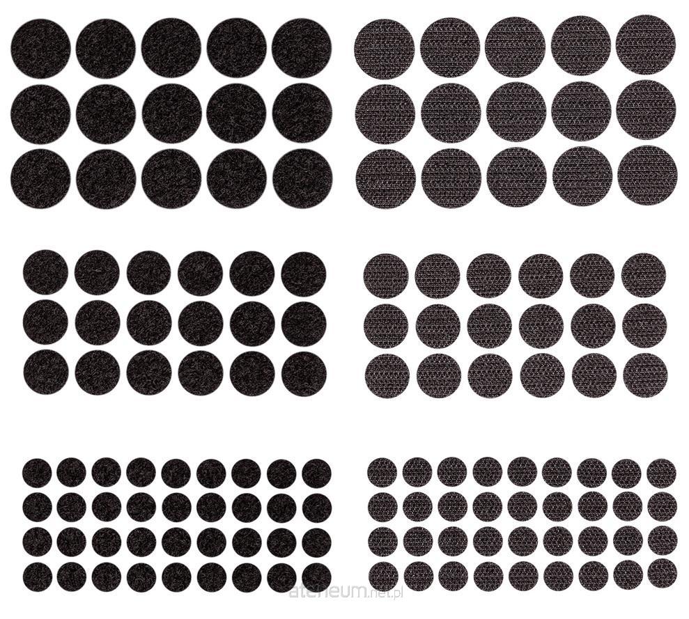 Zestaw czarnych rzepów samoprzylepnych w trzech rozmiarach pozwala na wielokrotne łączenie i rozdzielanie elementów.