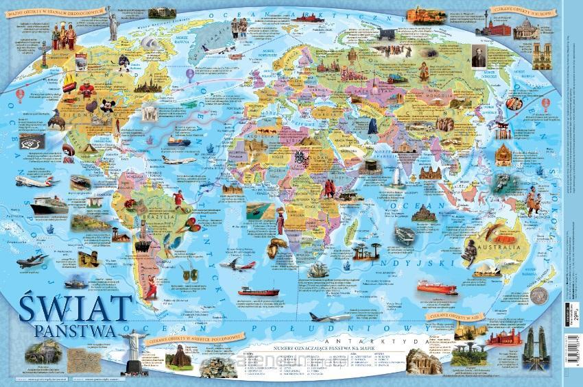 PODKŁADKA NA BIURKO PAŃSTWA ŚWIATA zawiera odwzorowania kształtów poszczególnych państw lub grup państw, obrazki z opisami zabytków, atrakcji turystycznych i ciekawostek oraz opisy najważniejszych mórz i oceanów.