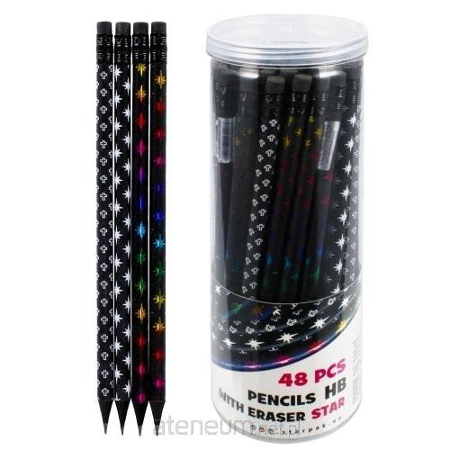 Zestaw ołówków okrągłych z gumką Star z kolekcji STARPAK pakowanych w tubie po 48 szt. Każdy ołówek wykonany z trwałego drewna, zapewnia komfort rysowania i pisania zakończony jest gumką. Ołówek nie łamie się podczas strugania a gumka nie brudzi.