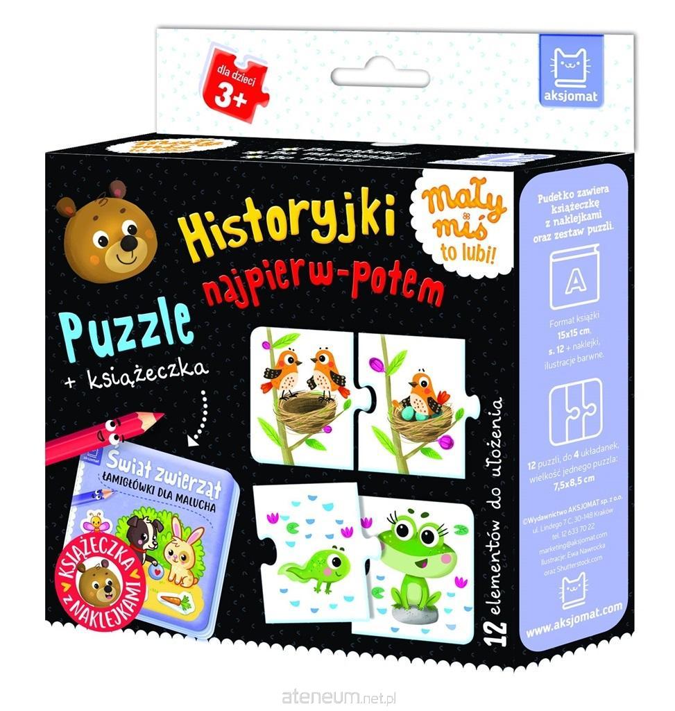 Puzzle służą do ułożenia 4 historyjek. Fragmenty połączone w odpowiedniej kolejności pokazują etapy rozwoju motyla, żaby, piskląt i wzrostu wiśni. Zabawa polega na skojarzeniu pasujących do siebie fragmentów i ułożeniu ich w odpowiedniej kolejności. W książeczce znajdują się łamigłówki oraz zadania rysunkowe z wykorzystaniem dołączonych do książki barwnych naklejek. Dla dzieci powyżej 3. roku życia.