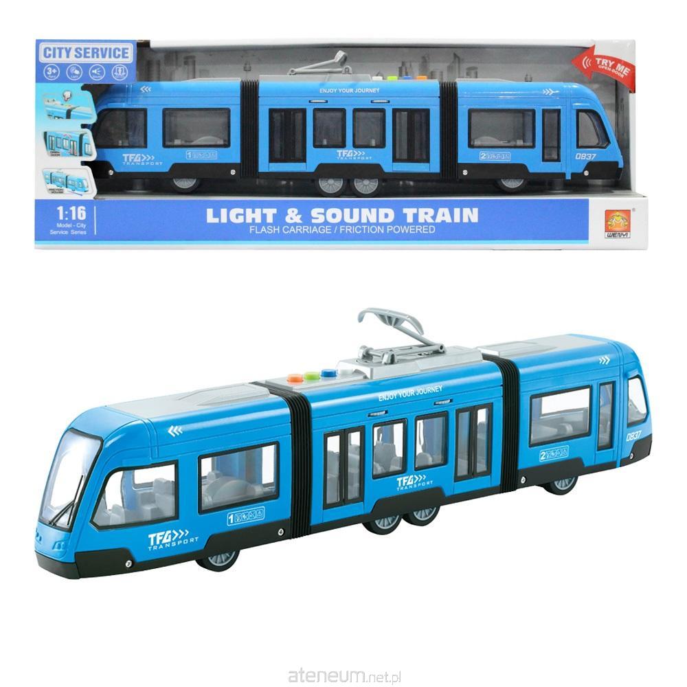 Niebieski tramwaj z otwieranymi drzwiami oraz dźwiękami i światłem. Skala 1:16 Wymagane baterie - 3 x AG13 (dołączone). Wymiary opakowania: 48 x 11 x 6.5 cm.
