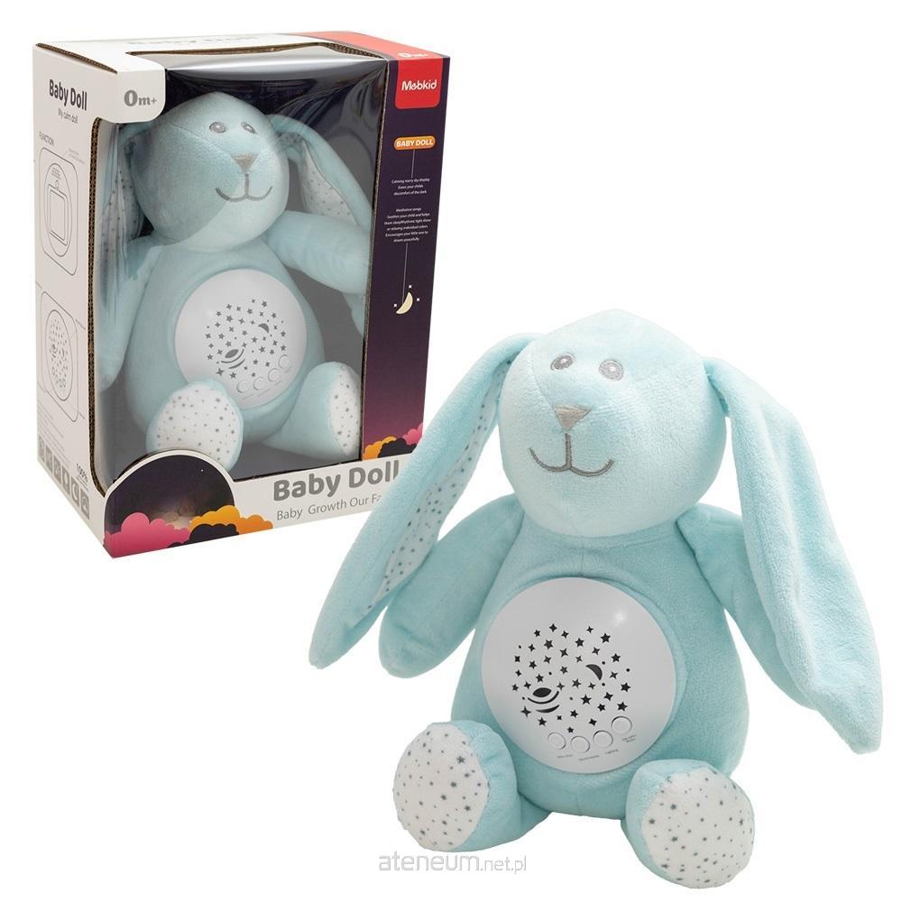Projektor lampka - zajączek. Delikatne dźwięki muzyki. Kolorowy projektor, który wyświetla gwiazdki na ścianach lub suficie. Mechanizm można wyjąć i wyprać pluszaka. Wymiary opakowania: 26 x 19 x 14 cm