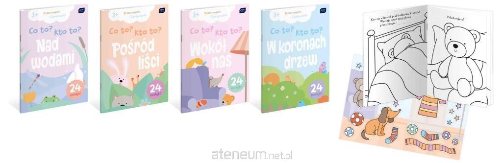 Format: A4. Liczba kartek: 16. Seria czterech książeczek z kolorowankami przeznaczona dla dzieci powyżej 3 lat. Duże naklejki w zestawie. Tytuły dostępne w serii: Nad wodami, Pośród liści, Wokół nas, W koronach drzew.