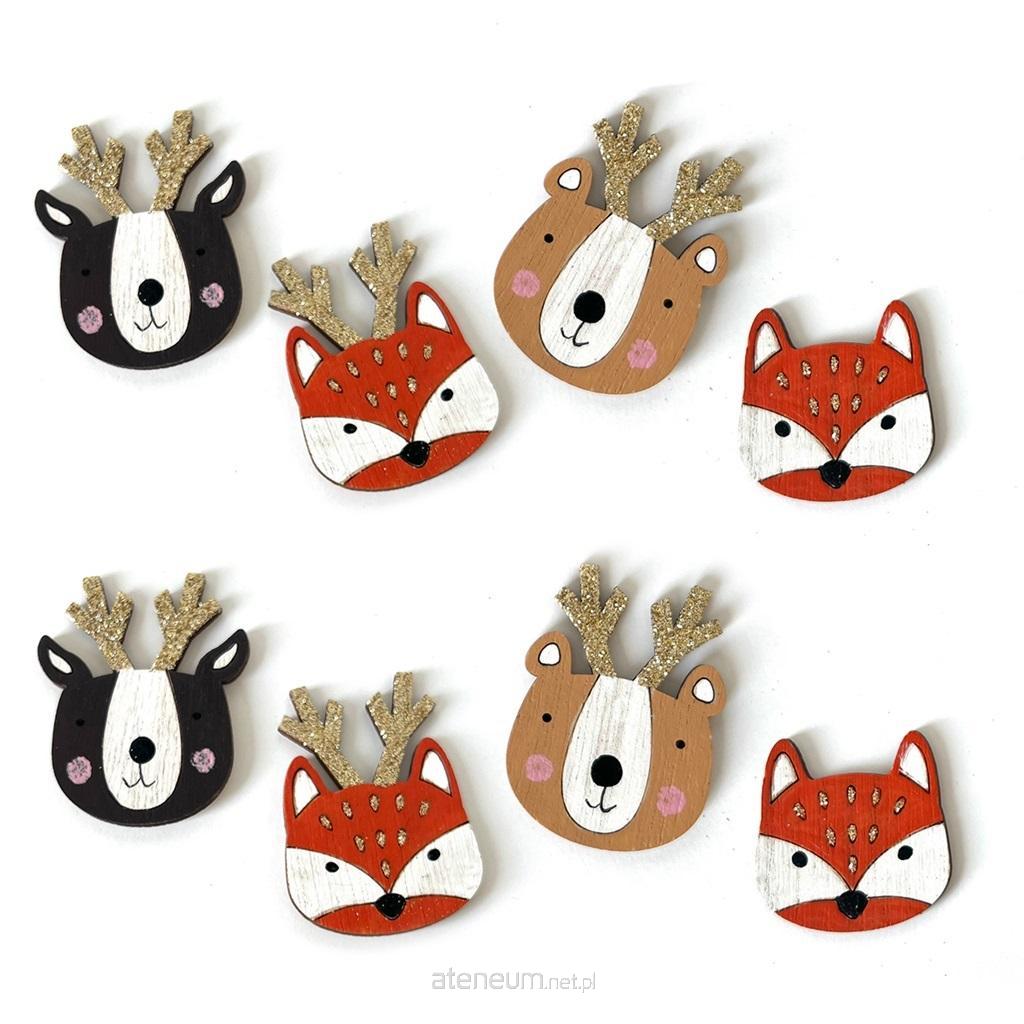 Drewniane pyszczki lisków i misiów sprawdzą się doskonale jako dodatek do jesiennych oraz świątecznych prac kreatywnych. Wszystkie zwierzątka są pomalowane farbą. Część z nich (6 szt.) ma pokryte złotym brokatem reniferowe różki, który przyozdabia także cętki czterech lisków.