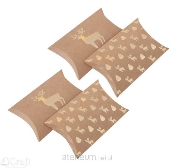 Pudełka składane typu pillow box z motywem złotych jelonków i choinek to doskonałe opakowania na świąteczne prezenty. Można schować do nich m.in. vouchery podarunkowe, biżuterię lub inne, drobne upominki. Te tekturowe pudełka nadają się także do dodatkowego zdobienia np. wstążeczkami, naklejkami lub drewnianymi elementami. Pudełeczka są do samodzielnego złożenia.