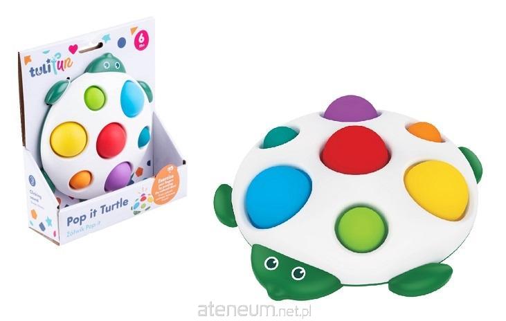 Odprężająca zabawa we wciskanie kolorowych kuleczek to wciągająca rozrywka, a zarazem trening małych paluszków! Żółw posiada na skorupie siedem kuleczek, a każda z nich jest w innym kolorze. Zadaniem malucha jest wcisnąć je do środka, a następnie z powrotem przepchnąć je od spodu na zewnątrz. Czynności tej towarzyszy zabawny odgłos klikania.