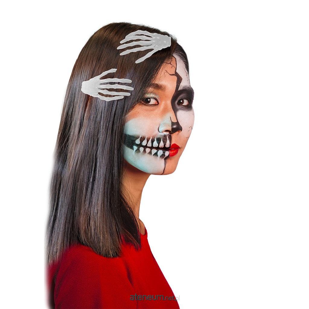 Spinki do włosów z formie kościstych rąk. Ciekawy dodatek do stroju na zabawy halloweenowe lub bal przebierańców. Wielkość ok. 7 cm. W opakowaniu znajdują się 2 sztuki.