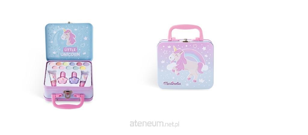 Teczka z uchwytem do makijażu dziecięcego. Zawartość: 11 cieni do powiek, 2 lakiery do paznokci, 2 błyszczyki do ust.