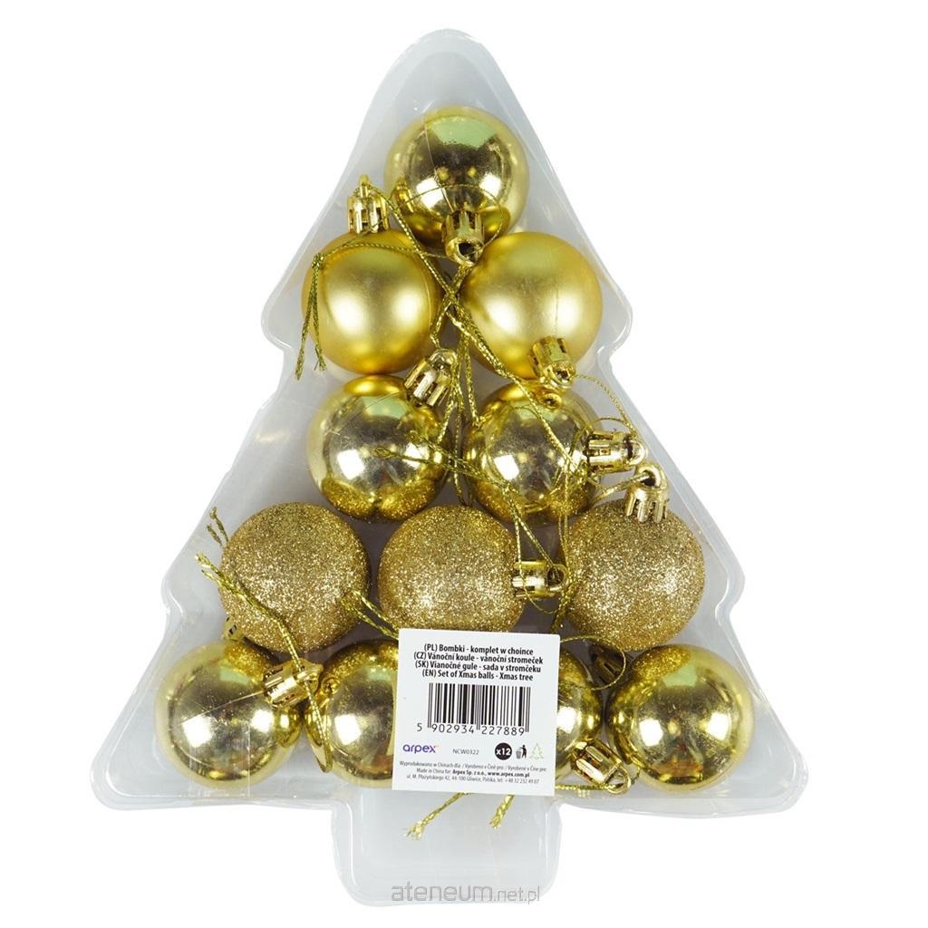 Zestaw bombek w świątecznym opakowaniu w kształcie choinki. Opakowanie transparentne umożliwiające zapoznanie się z produktem bez wyjmowania z pudełka. Zestaw zawiera trzy rodzaje bombek gładkie, matowe oraz brokatowe. 12 sztuk w opakowaniu. Bombki o średnicy 4 cm.