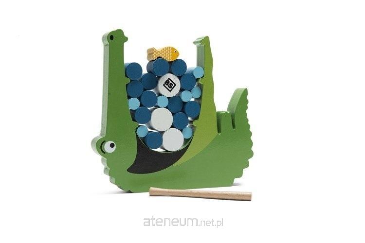 W zestawie znajdują się: duży, drewniany zielony "Croco" (22x20 cm), drewniany patyczek (12 cm), 22 szt drewnianych elementów (1,5-2,5 cm) oraz drewniana, żółta rybka (4 cm)