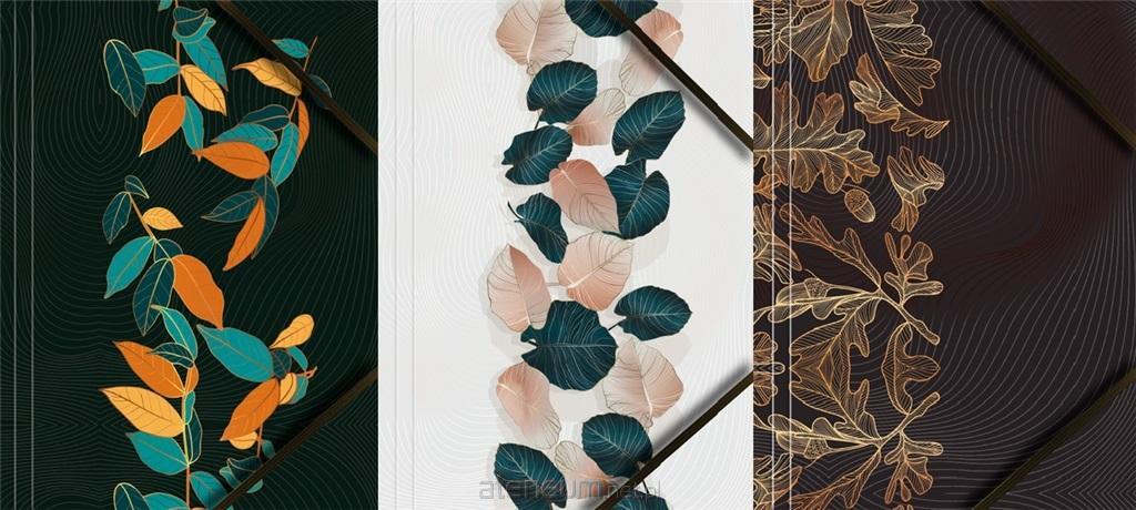 Teczka kartonowa z grafiką i gumką narożną, format A4, lakierowana. Wymiary teczki 320x240 mm. Dostępne w czterech zestawach, w każdym zestawie - 3 różne grafiki (M1-owoce, M2-liście, M3-pastelowe kwiaty, M4-róże). Opakowanie: folia 6 szt.