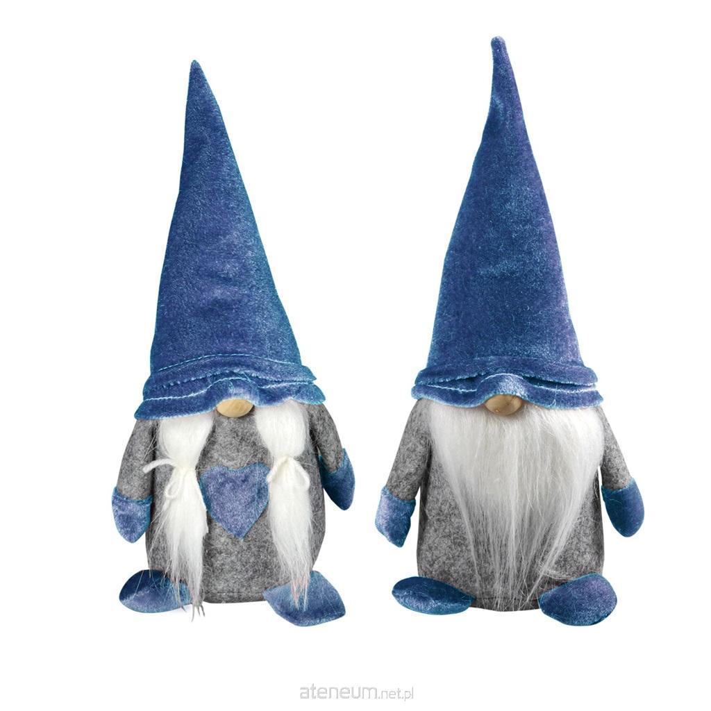 Skrzat dekoracyjny wykonany z filcowej podstawy w kolorze szarym oraz elementów welurowych w kolorze niebieskim. Nos skrzata wykonano z drewna. Dekoracja dostępna w dwóch wariantach: skrzat z puchatą brodą lub pani skrzatowa z puchatymi włosami. Dekoracja stojąca, dół ozdoby został obciążony, aby umożliwić stabilne jej postawienie. Uniwersalna dekoracja świąteczna pasująca do każdego wnętrza lub ciekawy pomysł na prezent. Ozdoba o wymiarze: 25 cm.