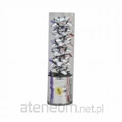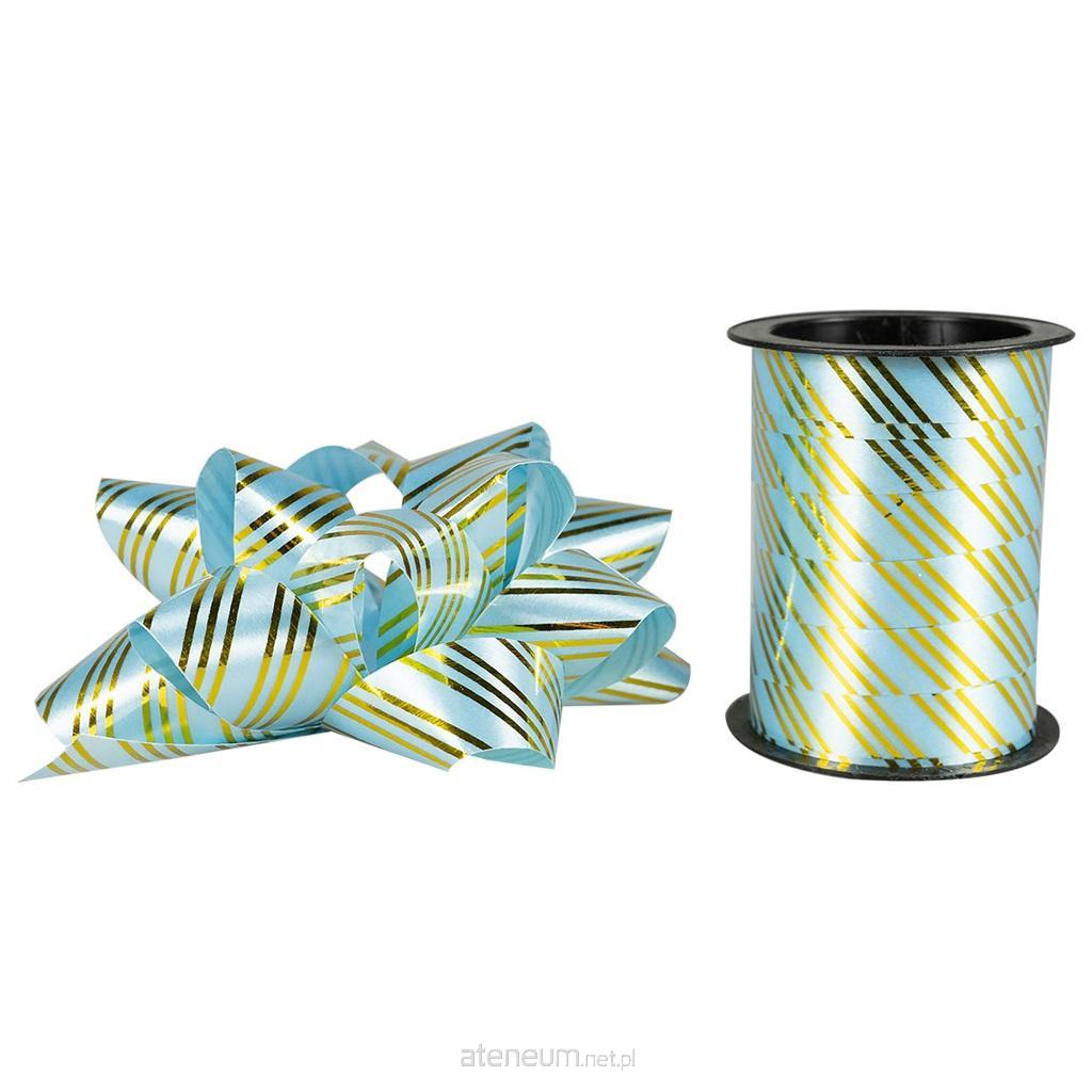 Zestaw do dekoracji prezentów wykonany z tworzywa sztucznego w kolorze niebieskim. W skład zestawu wchodzi rozeta oraz wstążka na szpuli. Produkt zdobiony jest złotymi, drobnymi paseczkami. Komplet do pełnej dekoracji opakowanego prezentu. Wymiary produktów: rozeta 10 cm, długość taśmy 100 cm.