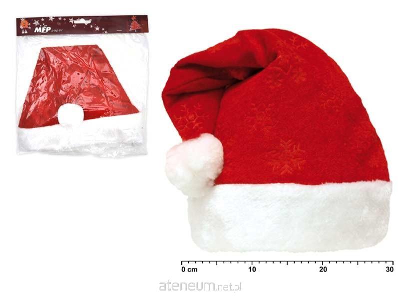 Czapka Mikołaja w kolorach czerwonym i białym z tłoczeniem w kształcie śnieżynek. Doskonałe uzupełnienie stroju Świętego Mikołaja. Zapakowana w worek z zawieszką euro. Obwód głowy: 58 cm Długość czapki z pomponem: 43 cm