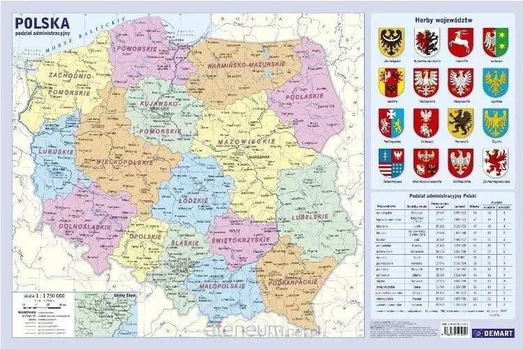 Na mapie Polski w skali 1 : 1 750 000 przedstawiono podział administracyjny Polski. Różnymi kolorami zostały wyróżnione obszary 16 województw, a w ich obrębie zaznaczono granice powiatów. Większym fontem podpisano siedziby władz wojewódzkich, przeważnie urzędujące w jednym mieście, tylko w przypadku dwóch województw są w dwóch ośrodkach. Mniejsze opisy wskazują siedziby władz powiatowych lub nazwy powiatów niewywodzące się od nazw tych miast np. powiat łódzki wschodni. Obok mapy znajdują się herby wszystkich województw oraz ważne charakterystyki liczbowe 16 województw: powierzchnia liczba ludności liczba powiatów i miast. To znakomita pomoc w przyswajaniu struktury samorządowej naszego kraju! Użytkowe walory podkładki są jej kolejnym atutem: jest wykonana na gumowanej piance dobrze stabilizującej ją na biurku, na wierzchu pokrywa ją przezroczysta matowa folia - przyjemna w dotyku - po której nawet można pisać pisakiem i ścierać potem zapiski.
