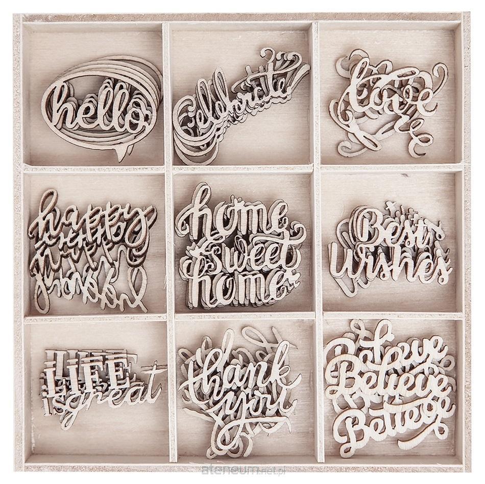 Podkreśl charakter i przekaz swoich prac, korzystając z chipboardów z napisami w oryginalnych czcionkach. W zestawie znajdziesz drewniane kształy z pozytywnymi hasłami, m. in.: "love", "happy", "Life is great", "Best wishes" i "Thank you".